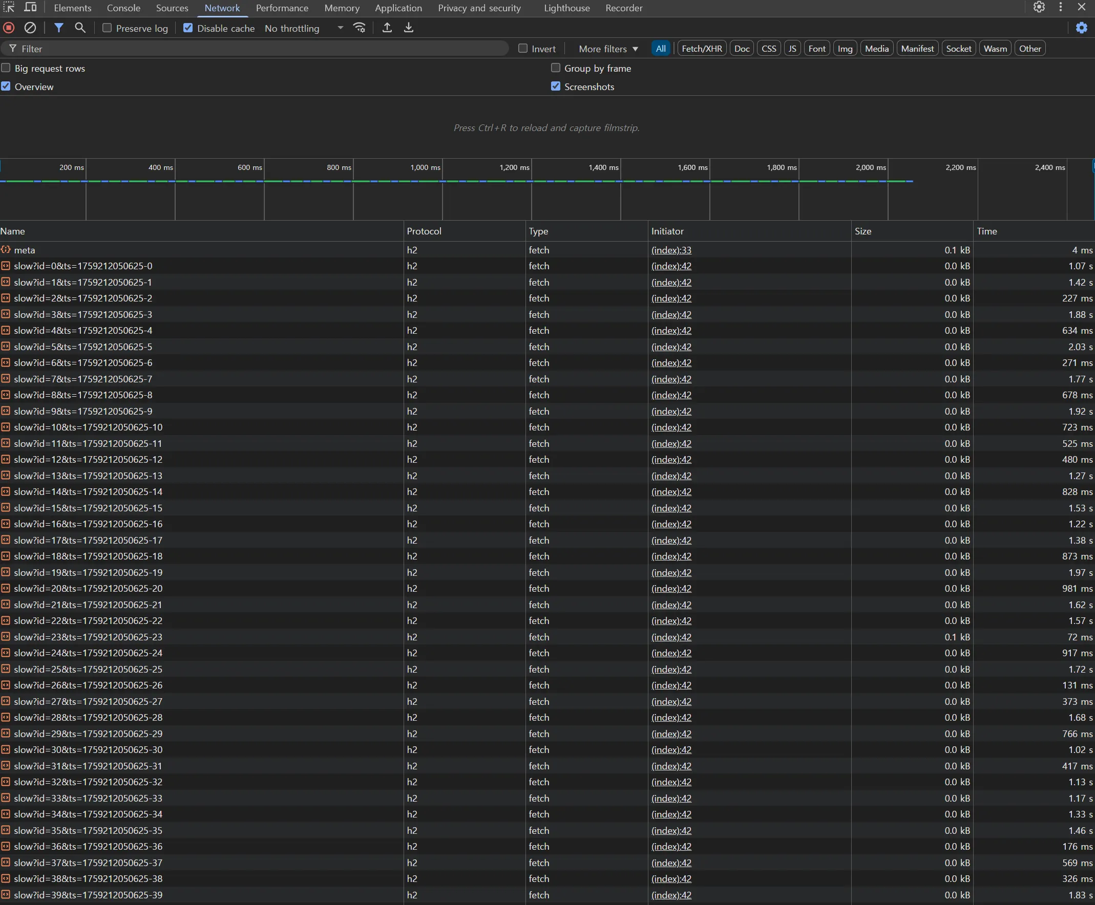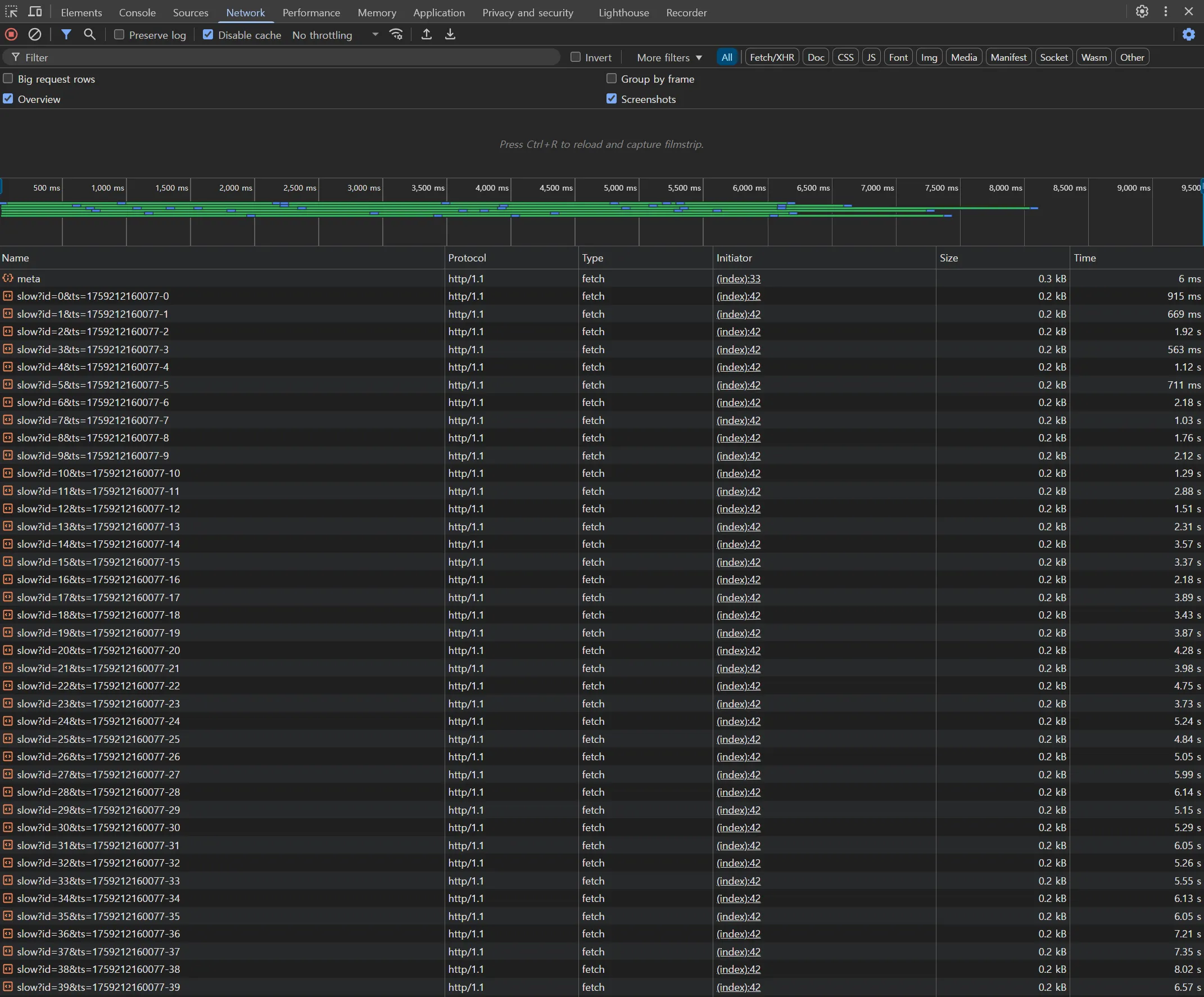 총 완료 시간이 더 길게 나온다. 동시에 6개 정도만 처리되고, 뒤 요청이 앞 요청에 줄 세워져 대기(HOL)하는 패턴이 Waterfall에 나타납니다.