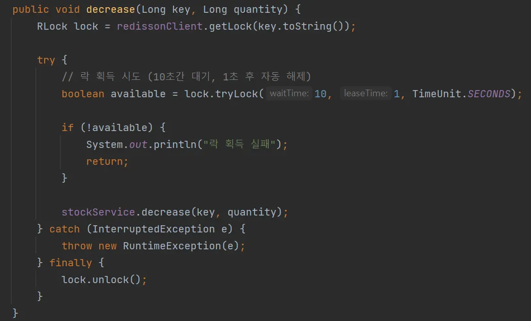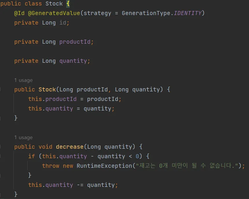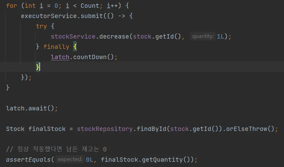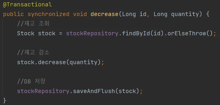 그렇게 편한 상태로 메서드 내부 로직(재고 조회 -> 수량 감소)을 실행한다.