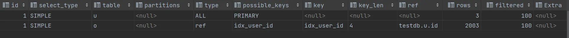 - ref: testdb.u.id (인덱스를 탐색할 때 users 테이블의 id 값을 사용한다는 의미)