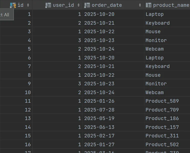 - 주문 테이블에는 유저id, 주문 날짜, 주문한 상품 이름 (테스트를 위해 약 6천개의 주문을 생성했다.)
